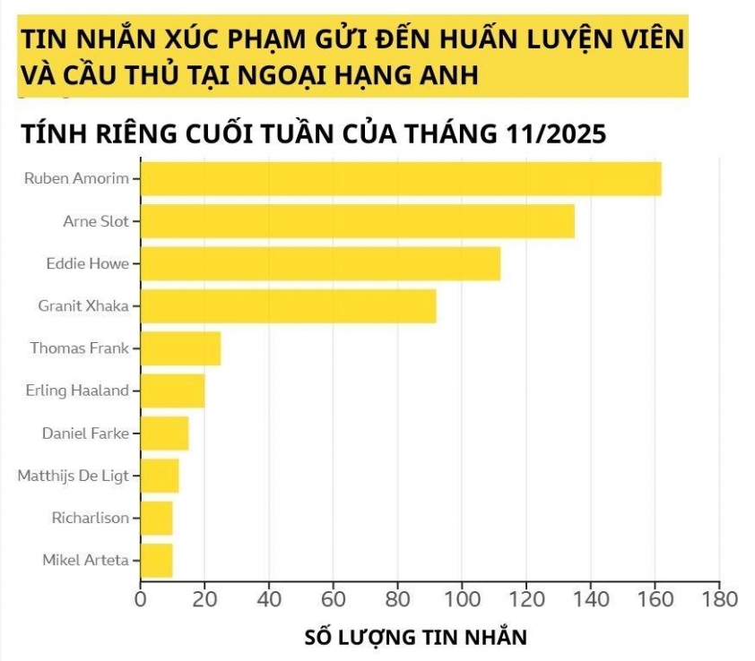 Một cuộc điều tra gần đây cho thấy tình trạng lạm dụng trên mạng đang ở mức đáng báo động tại Ngoại Hạng Anh. Chỉ trong một cuối tuần, hơn 2.000 bài đăng mang tính cực đoan, từ xúc phạm đến dọa hành hung, đã được gửi tới HLV và cầu thủ. Trong đó, Ruben Amorim, Arne Slot và Eddie Howe là những người bị nhắm nhiều nhất.