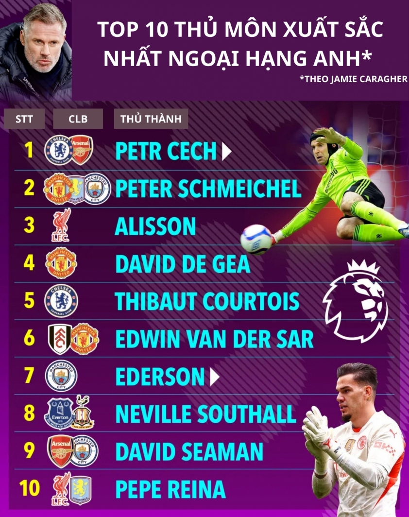 Huyền thoại một thời của Liverpool, Jamie Carragher tiếp tục khiến cộng đồng mạng dậy sóng khi công bố danh sách 10 thủ môn xuất sắc nhất lịch sử Ngoại Hạng Anh.
