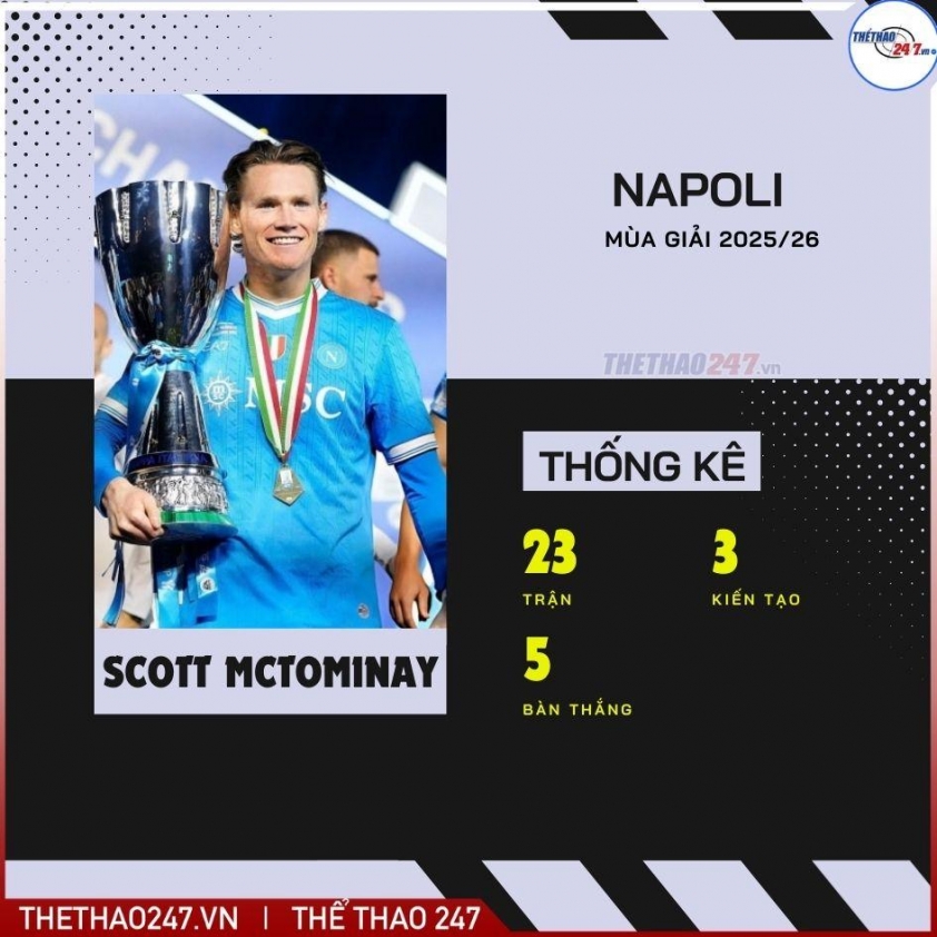 Kể từ khi gia nhập Napoli, Scott McTominay đã có màn lột xác ngoạn mục, thậm chí vượt xa mọi kỳ vọng. Tại Serie A, tiền vệ người Scotland không chỉ nhanh chóng chiếm suất đá chính mà còn trở thành mắt xích không thể thiếu trong hệ thống chiến thuật của HLV Antonio Conte. Đỉnh cao cho hành trình thăng hoa ấy là danh hiệu Cầu thủ xuất sắc nhất Serie A, một sự ghi nhận đầy thuyết phục cho phong độ ổn định, tầm ảnh hưởng và tinh thần thủ lĩnh của McTominay.