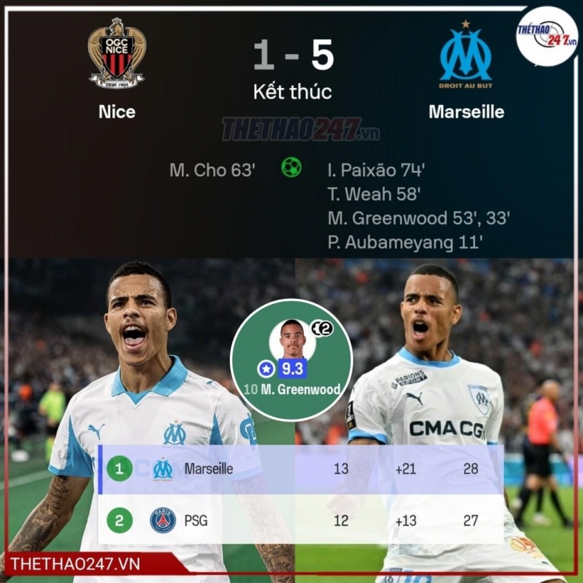 Cú đúp tại Riviera giúp Greenwood độc chiếm ngôi đầu danh sách phá lưới Ligue 1, với 10 bàn và 3 kiến tạo sau 12 trận, một hiệu suất ấn tượng trong màu áo Marseille sau khi anh gia nhập với mức phí 27 triệu Bảng.