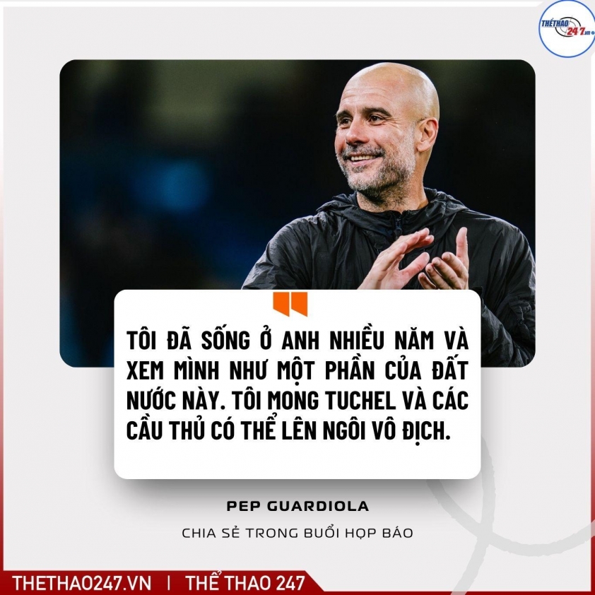 Gây chú ý hơn cả, Pep nhấn mạnh ông muốn tuyển Anh nằm trong nhóm ứng viên hàng đầu và thậm chí mong họ làm nên lịch sử. Ông chia sẻ: "Tôi không cố tỏ ra tốt đẹp gì đâu, nhưng tôi đã sống ở đây nhiều năm và coi mình là một phần của đất nước này. Tôi muốn Thomas và mọi người thực hiện được điều đó." Lời phát biểu này nhanh chóng lan truyền mạnh mẽ, khiến người hâm mộ Anh quốc đầy phấn khởi trước sự ủng hộ từ một trong những HLV xuất sắc nhất thế giới.