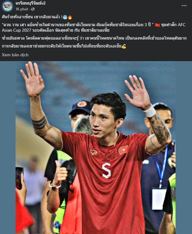 "Cơn ác mộng của cả Đông Nam Á đã trở lại! Đoàn Văn Hậu, hậu vệ trái huyền thoại của đội tuyển Việt Nam chính thức tái xuất sau gần 3 năm vắng bóng trong trận đấu cuối cùng vòng loại AFC Asian Cup 2027 gặp đội tuyển Malaysia. 'Cánh trái dữ dằn', ai theo dõi bóng đá Đông Nam Á đều biết cầu thủ này đáng sợ thế nào. Một hậu vệ có lối chơi cực kỳ quyết liệt, vào bóng mạnh mẽ và đầy máu lửa. Sự trở lại của anh được kỳ vọng sẽ nâng tầm đội tuyển Việt Nam, giúp đội vươn lên cạnh tranh với các đội bóng hàng đầu châu Á."- fanpage Thái Lan đăng tải.