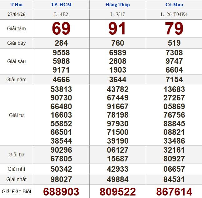 XSMN 27/4/2026 - Kết quả xổ số TP.HCM - Đồng Tháp - Cà Mau hôm nay 27/4/2026