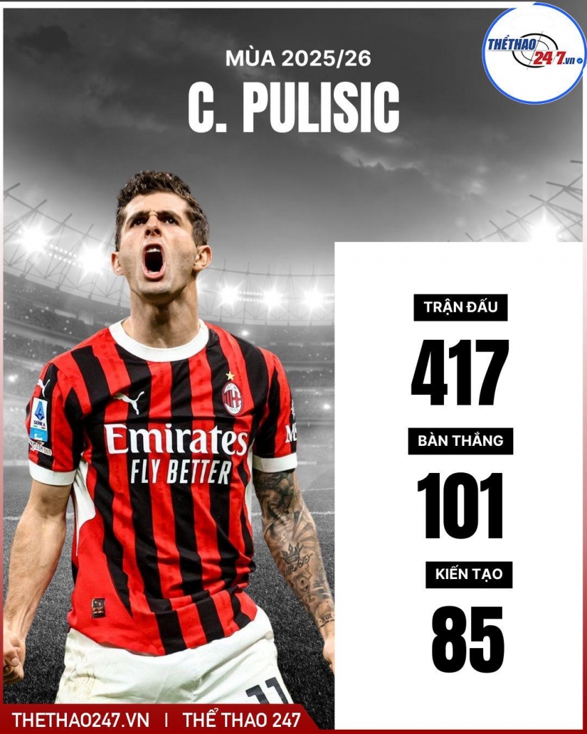 Dù mùa này có thời điểm bị ảnh hưởng bởi vấn đề thể lực, thông số của Pulisic tại Italy vẫn rất ấn tượng, 10 bàn thắng và 2 kiến tạo chỉ sau 20 trận ra sân. Những con số ấy càng củng cố niềm tin của Arsenal, đội đang nuôi tham vọng lật đổ Manchester City ở cuộc đua tại Premier League.