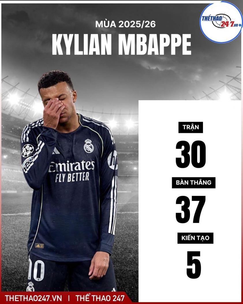 Mùa này, Mbappe đang là nguồn sống của Real Madrid với 37 bàn và 5 kiến tạo sau 30 trận đấu. Mùa giải chật vật của Kền kền trắng có thể trở thành thảm họa nếu không có phong độ xuất sắc và ổn định của Mbappe.
