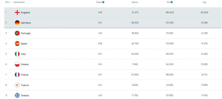 Khi giai đoạn league stage của Champions League đã khép lại, bức tranh về những quốc gia có khả năng nhận thêm suất mùa tới cũng dần rõ ràng hơn. Tính đến hiện tại, Anh đang dẫn đầu bảng xếp hạng với 20,069 điểm, Đức đứng thứ hai với 15,285. Bồ Đào Nha xếp thứ ba với 14.700 điểm, còn Tây Ban Nha đứng thứ tư với 14,375.