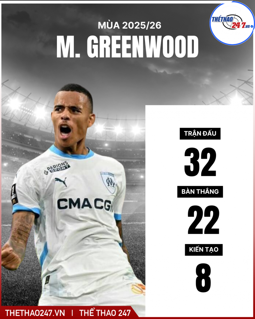Mùa này, sau 31 trận, Greenwood ghi 22 bàn và có 8 kiến tạo trên mọi đấu trường, thống kê đủ để đưa anh vào nhóm các chân sút có sức ảnh hưởng lớn nhất châu lục.