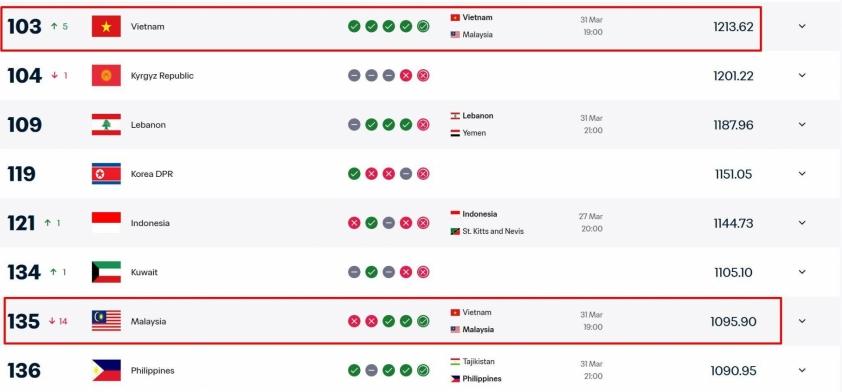 Cụ thể, Malaysia bị trừ khoảng 50 điểm, tụt tới 14 bậc – từ vị trí 121 xuống 135 thế giới. Đây được xem là cú sốc lớn với bóng đá nước này, đồng thời tạo ra làn sóng phản ứng mạnh mẽ trên truyền thông.