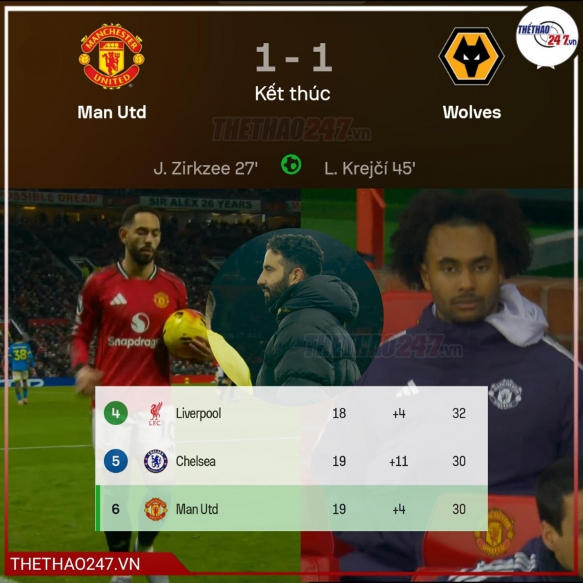 Manchester United bị Wolverhampton Wanderers cầm hòa 1-1 trong khuôn khổ Ngoại hạng Anh vòng 19. HLV Ruben Amorim xác nhận việc ông thay Joshua Zirkzee ngay sau giờ nghỉ là quyết định mang tính chiến thuật, chứ không xuất phát từ chấn thương.