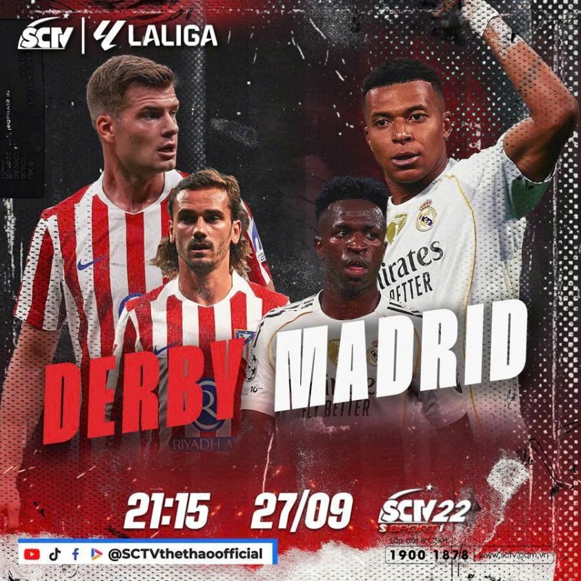 Derby Madrid – cuộc đối đầu rực lửa giữa Atlético Madrid và Real Madrid – sẽ diễn ra vào lúc 21h15 ngày 27/9/2025, thuộc khuôn khổ vòng 7 LALIGA EA Sports 2025/26. Người hâm mộ tại Việt Nam theo dõi trực tiếp và duy nhất trên kênh SCTV22 của truyền hình cáp SCTV, ngoài ra, trước đó 30 phút sẽ là chương trình bình luận trước trận đấu được lên sóng trực tiếp vào lúc 20h45 ngày 27/9/2025.