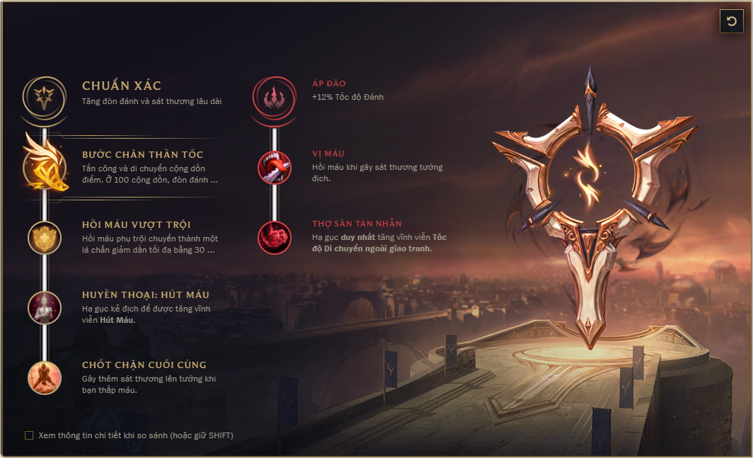 Huyền Thoại: Hút máu gia tăng vĩnh viễn một lượng máu lớn khi bạn liên tục gây sát thương lên kẻ địch. Mụch đích chính của nhánh này giúp bạn có những cuộc đấu solo thậm chí là 1vs2 nếu bạn có 1 lượng trang bị nhất định.