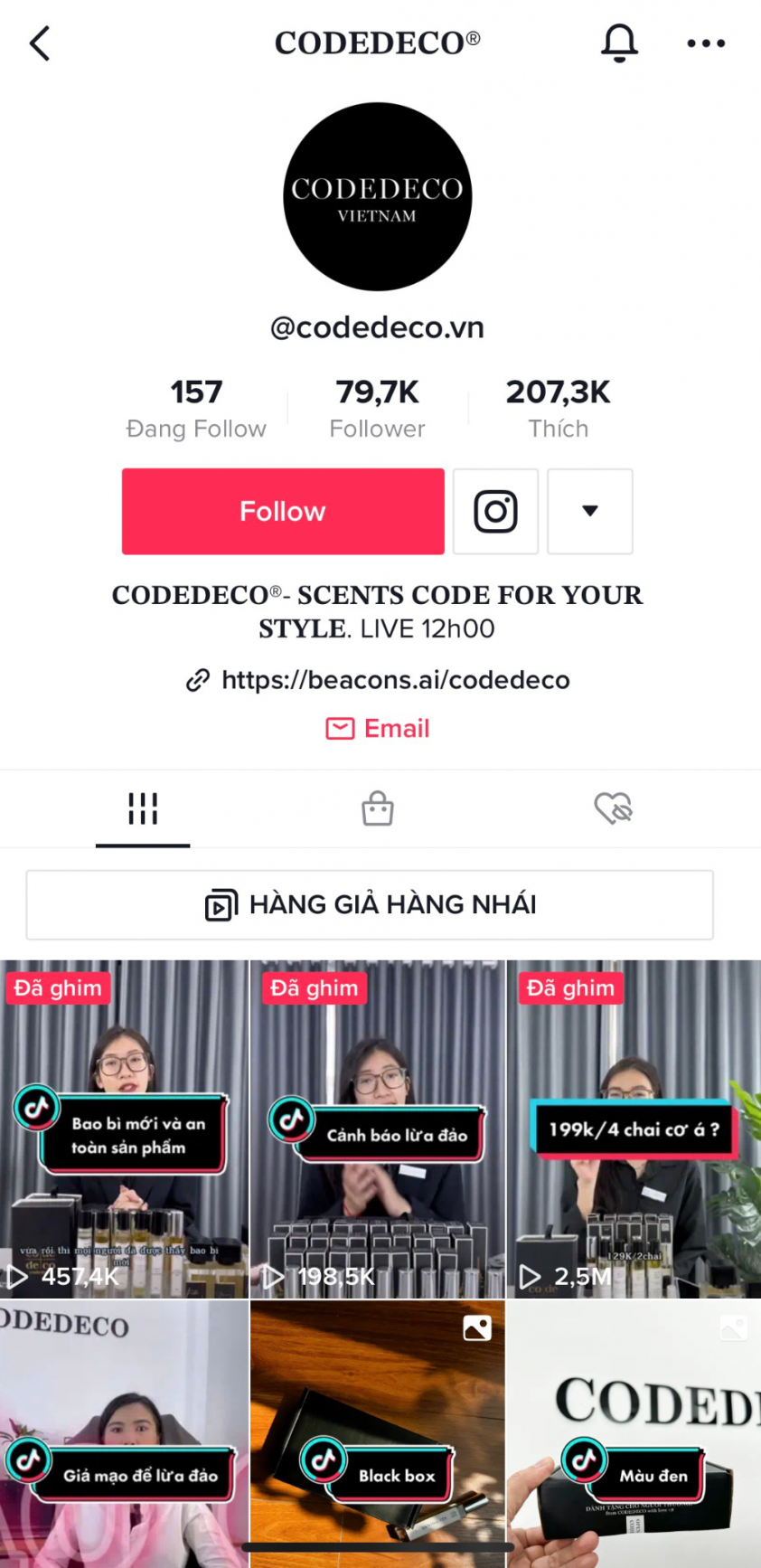 Bên cạnh đó, chị Nhung hiện cũng xây dựng một kênh Tik Tok dành riêng cho thương hiệu nước hoa CODEDECO. Với nội dung bổ ích, hấp dẫn nên hiện nay, tài khoản này có tới gần 80 ngàn người theo dõi và đạt hơn 207,3k lượt thích video. Đây cũng là con số vô cùng ấn tượng cho một kênh tik tok mới lập về nước hoa trên nền tảng này.