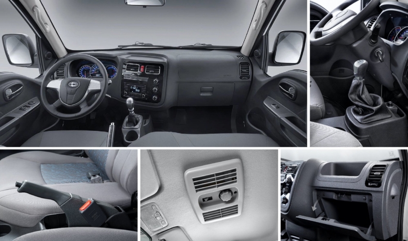 Khoang cabin được thiết kế để tối ưu không gian cho 02 người ngồi với khoảng để chân rộng, trần xe cao và thoáng. Tất cả ghế bọc nỉ cao cấp, êm ái và dễ vệ sinh. Dây đai an toàn 3 điểm trang bị tiêu chuẩn.