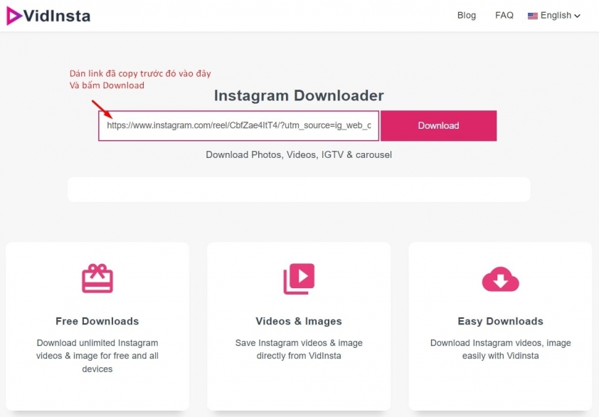 - Bước 2: Truy cập vào trang https://vidinsta.app/vi, dán link video mà bạn vừa copy trước đó và click vào Download.