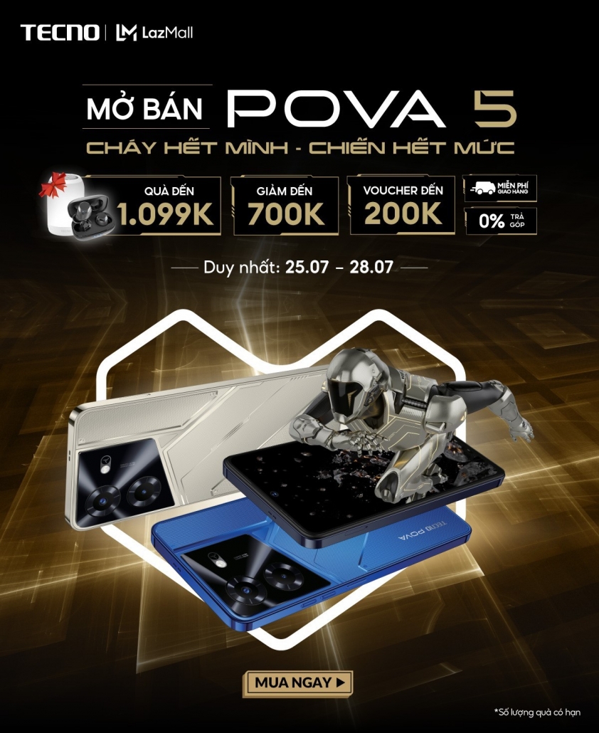 Từ ngày 25/7, POVA 5 sẽ mở bán chính thức tại Lazada, Với chương trình ưu đãi độc quyền mở bán tại LazMall từ ngày 25-28.07 với nhiều phần quà hấp dẫn lên đến 1.099.000 đ cùng nhiều voucher giảm giá hấp dẫn: https://imp.gg/pova5-pr-kol