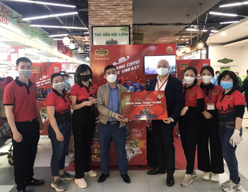 Cụ thể, ngoài giải thưởng là ô tô điện Vinfast VFE34 còn có hàng chục xe máy điện Vinfast, Honda Airblade, Iphone 12 Pro max, Wave Alpha và hàng trăm nón bảo hiểm, túi xách, ba lô, voucher WE (mua sản phẩm King Coffee trên app WE4.0) mệnh giá 500 ngàn đồng.