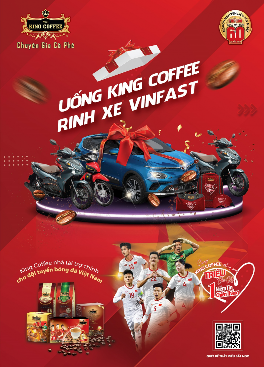 - Cơ hội 2: Mua sản phẩm King Coffee nhận phiếu trúng thưởng ngay trong bao bì để có cơ hội trúng xe Honda Air Blade, xe Honda Wave Alpha...