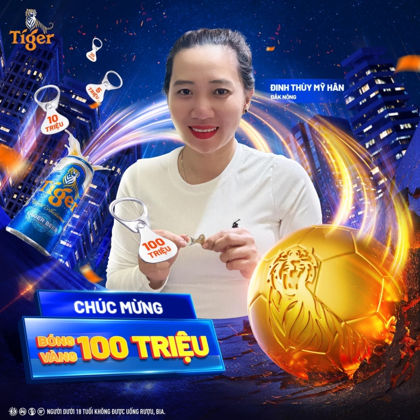 Mới đây, trang fanpage chính thức của Tiger Beer đã chính thức công bố chị Đinh Thùy Mỹ Hân trở thành chủ nhân thứ 13 trúng quả bóng vàng trị giá 100 triệu đồng trong chương trình "Bật lon 250 ml, nâng bóng vàng 100 triệu" . Sau gần 3 tháng triển khai, hành trình bóng vàng Tiger đã mang đến niềm vui và sự háo hức cho hàng ngàn người hâm mộ khi “bật nắp” Tiger Beer. Tính đến thời điểm hiện tại, bóng vàng Tiger 100 triệu đã có mặt tại nhiều tỉnh thành thuộc cả ba khu vực: Bắc Trung Bộ, Đồng Bằng Sông Cửu Long và Tây Nguyên – Duyên Hải Miền Trung, mang lại những khoảnh khắc cuồng nhiệt chưa từng có cho người hâm mộ.