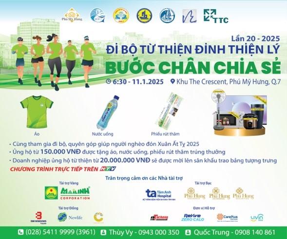 Chương trình Đi bộ từ thiện Đinh Thiện Lý lần 20 – 2025 sẽ diễn ra vào sáng ngày 11/1/2025 tại khu Hồ Bán Nguyệt, đô thị Phú Mỹ Hưng, Quận 7, TP.HCM và được truyền hình trực tiếp trên Đài truyền hình TP.HCM với hai kênh HTV7 và HTV Thể thao.