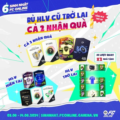 Tùy thuộc vào thời gian gắn bó cùng FC Online, các HLV sẽ nhận được gói quà đặc biệt sinh nhật 6 tuổi – Chơi càng lâu nhận quà càng ngầu.