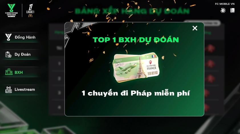 Mở rộng cơ hội cho toàn bộ cộng đồng, sự kiện mang đến một đặc quyền chưa từng có: Người chơi đạt Top 1 Bảng xếp hạng dự đoán và đồng hành cùng giải đấu sẽ chính thức trở thành chủ nhân của chuyến du lịch Pháp với thời gian 4 ngày 3 đêm, vé tham quan sân vận động và 1 vé VIP xem 1 trận đấu tại Ligue 1 McDonald’s. Với cơ chế minh bạch dựa trên kiến thức bóng đá và mức độ tương tác, giấc mơ đặt chân đến kinh đô ánh sáng Paris đang được hiện thực hóa một cách gần gũi nhất cho game thủ Việt.