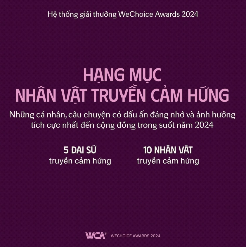 WeChoice Awards 2024 mong muốn sẽ lại là nơi để tất cả cộng đồng cùng tìm được cho mình những niềm cảm hứng tích cực, những câu chuyện để bạn được tiếp thêm sức mạnh và niềm tin vào giấc mơ của bản thân và cộng hưởng bởi tinh thần mạnh mẽ của hàng triệu trái tim khác. Hãy theo dõi và cùng WeChoice Awards 2024 tại www.wechoice.vn kể những câu chuyện về lòng tốt của người Việt, tính anh hùng của người Việt, sự tử tế của người Việt và tình yêu của người Việt với bề dày văn hóa lịch sử nước mình.