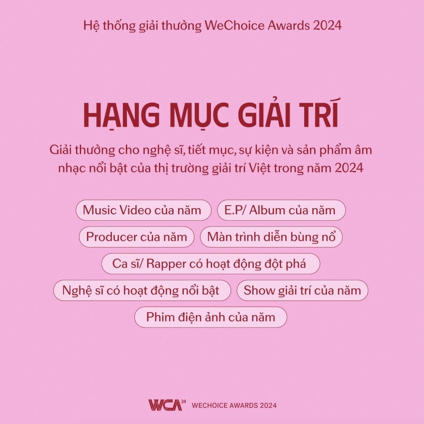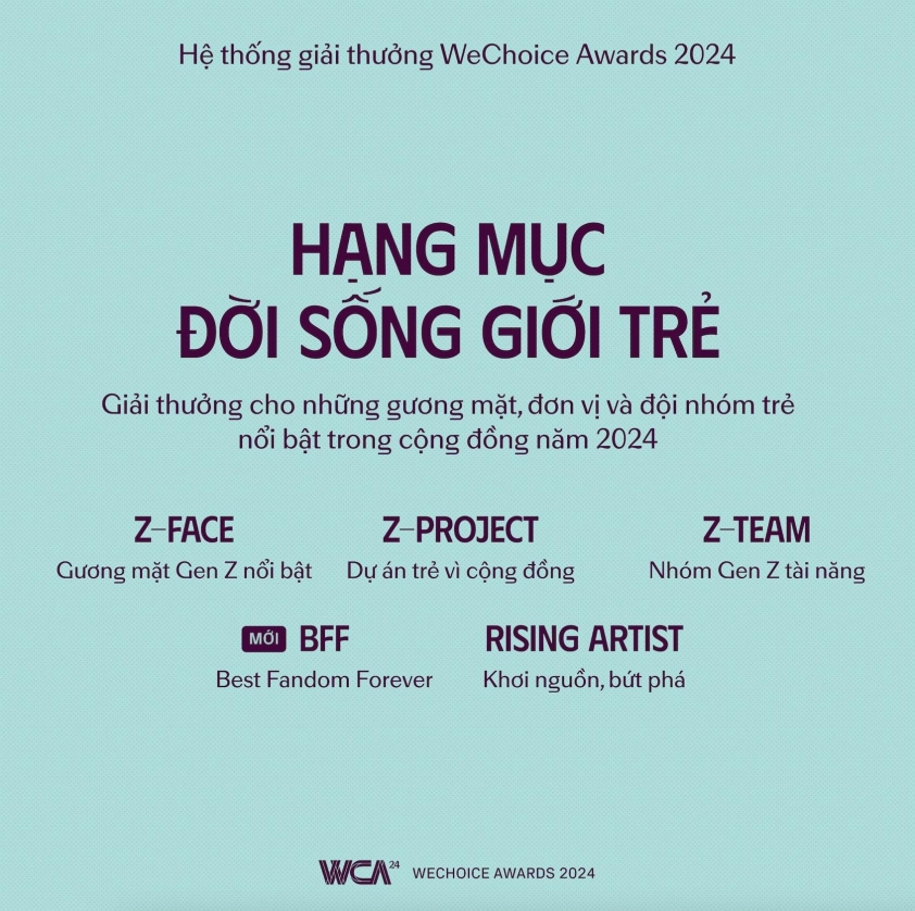 Hệ thống giải thưởng của WeChoice Awards 2024 bao gồm: Hạng mục Nhân vật truyền cảm hứng, Hạng mục Giải trí, Hạng mục GenZ Area, Hạng mục Trái tim dũng cảm, Hạng mục Dự án vì Việt Nam tôi. Trong đó, đáng chú ý là sự xuất hiện của “tân binh” đáng gờm BFF – Best Fandom Forever. Đây là cái tên mới toanh thuộc hạng mục GenZ Area. Sự xuất hiện của BFF cho thấy một năm với nhiều đỉnh cao và sự bứt phá của giải trí Việt nói chung, cũng như phản ánh văn hoá hâm mộ thần tượng Việt nói riêng của giới trẻ đã diễn ra mạnh mẽ và sôi động cỡ nào.