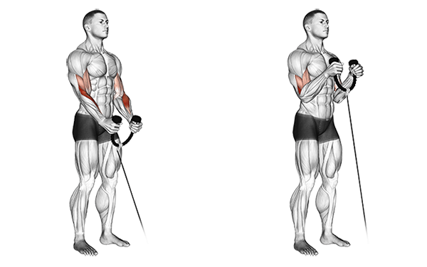 Khi hít vào, từ từ hạ thanh tạ xuống cho đến khi cánh tay trên mở rộng và bắp tay được kéo căng hoàn toàn. Nên thực hiện động tác này vào nửa cuối của buổi tập với số lần là 8-12 lần/hiệp.
