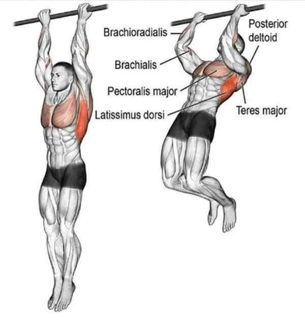 Cách thực hiện: Nắm chặt 2 tay trên tạ, 2 tay rộng bằng vai. Thu cơ bả vai lại và ấn chúng xuống, điều này sẽ giúp đảm bảo vai giữ nguyên vị trí trong quá trình tập. Sau đó, kéo ngực và cằm lên phía thanh tạ bằng cách gập tay và rướn người lên. Ổn định tư thế và quay trở lại vị trí bắt đầu.