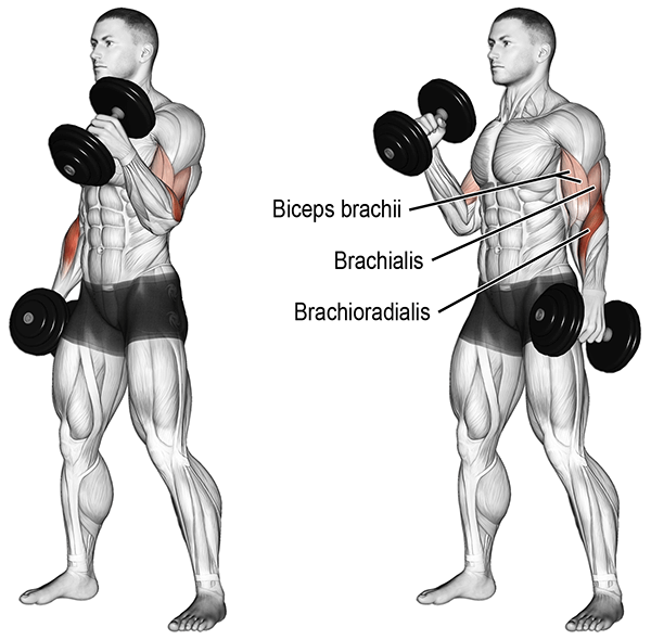 Cách thực hiện: Cầm một quả tạ vào mỗi tay. Xoay hai tay sao cho lòng bàn tay hướng vào đùi. Giữ khuỷu tay ở một vị trí cố định, gập khuỷu tay để cánh tay dưới nâng lên và hướng về vai. Giữ cho vai ổn định khi thực hiện. Tay nắm và cổ tay của bạn thẳng hàng với cẳng tay. Sau đó hạ tạ xuống vị trí bắt đầu.