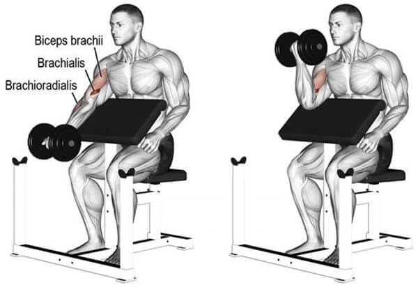 Cách thực hiện: Ngồi ngay ngắn vào ghế trên máy, đặt cánh tay lên trên và ngực dựa vào tấm đệm của băng ghế. Khi thở ra, sử dụng bắp tay để cuộn tạ lên cho đến khi bắp tay co lại hoàn toàn và thanh tạ cao ngang vai. Bóp mạnh bắp tay và giữ tư thế này trong 1 giây.