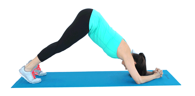 - Nằm sấp và duỗi chân ra xa nhất có thể. Ấn vai vào cơ thể và đặt cẳng tay trên sàn.