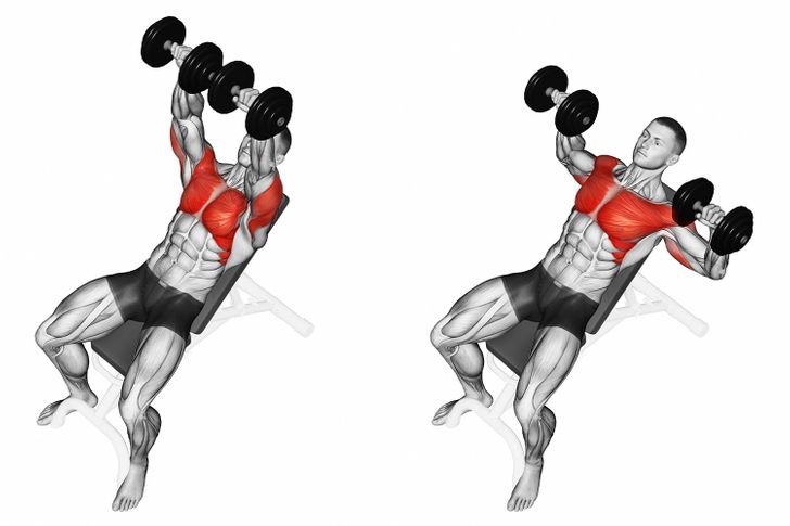- Đặt ghế nghiêng 15-30 độ. Nằm trên băng ghế với tạ trên tay. Giữ chúng trên ngực.