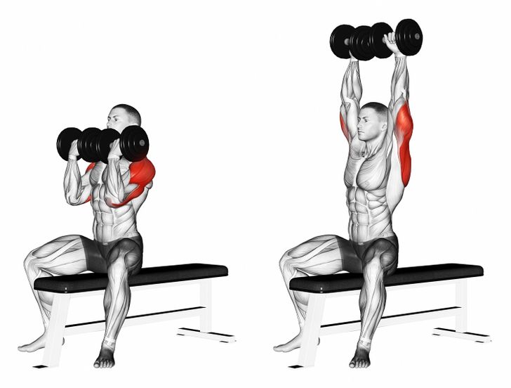 - Ngồi trên ghế dài, cầm tạ trên tay và nâng cao ngang ngực. Lòng bàn tay phải hướng vào cơ thể.