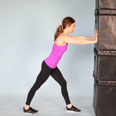- Dùng tay chống vào tường, giữ cho bụng săn chắc và nghiêng người cho đến khi bạn cảm thấy cơ bắp chân của chân sau căng ra.