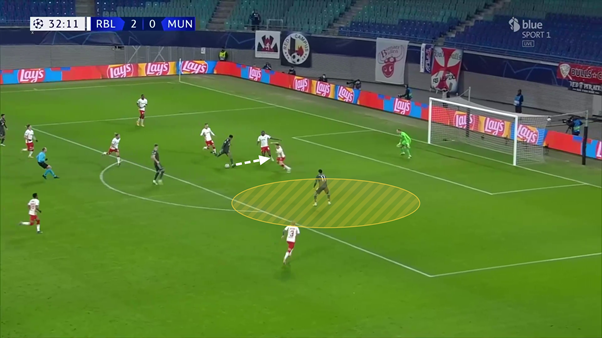 Thay vì cố gắng thực hiện đường chuyền mạo hiểm cho Olmo, Konate quyết định dùng bóng để dụ Hoffenheim gây áp lực lên mình. Không có đồng đội nào di chuyển nhưng Konate đã dùng tay chơi bóng với Yussuf Poulsen ở nửa đường biên, khiến đường chuyền của anh ấy trở nên lạc lõng.