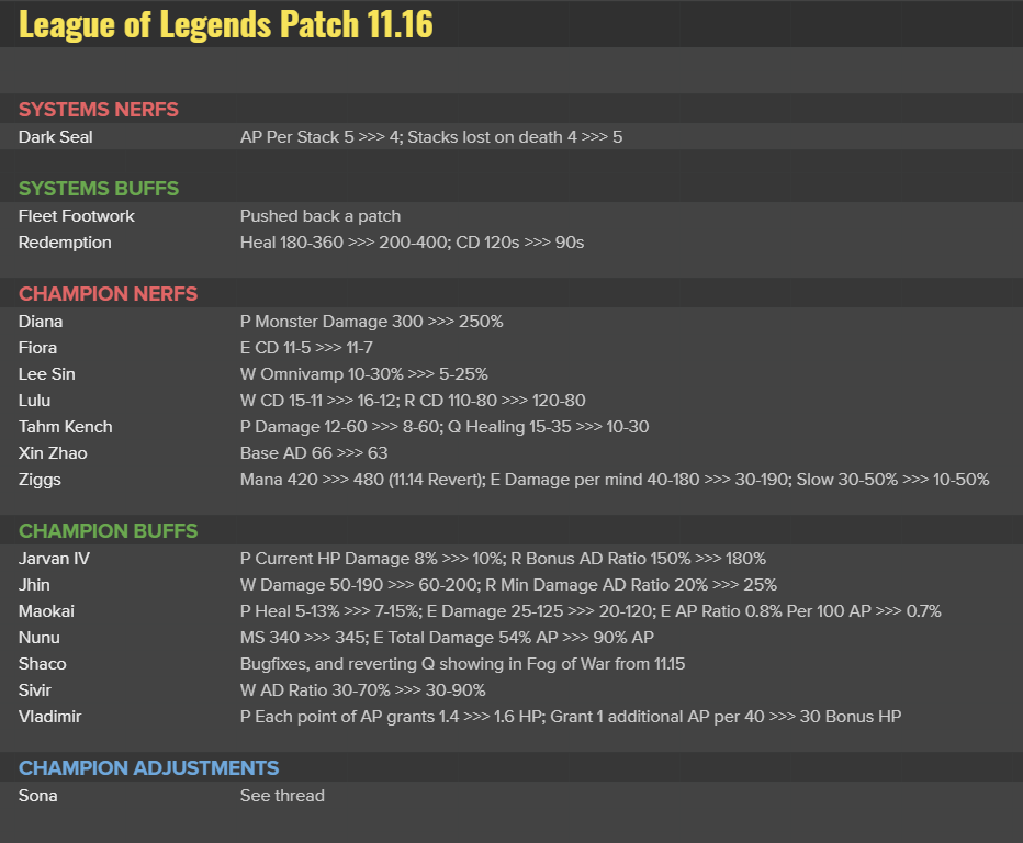Mới đây, đại diện của Riot Games đã hé lộ các thay đổi chi tiết trong phiên bản 11.16 sắp tới của tựa game LMHT. Các thay đổi bao gồm việc cân bằng lại tướng, trang bị, ngọc bổ trợ và điều chỉnh lại vị tướng Sona.