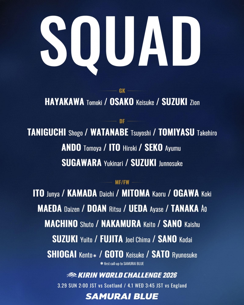 Mới đây, Liên đoàn bóng đá Nhật Bản (JFA) chính thức công bố danh sách 28 cầu thủ cho loạt trận giao hữu quốc tế vào cuối tháng 3 này. Theo đó, "Samurai xanh" sẽ lần lượt đối đầu Scotland vào ngày 29/3 tại sân Hampden Park (Glasgow), trước khi chạm trán Anh vào ngày 1/4 trên sân Wembley (London).
