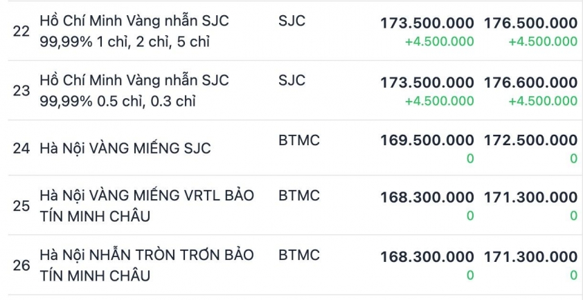 Tại TP.HCM, vàng nhẫn SJC 99,99% loại 1 chỉ, 2 chỉ và 5 chỉ được niêm yết quanh mức 173,5 triệu đồng/lượng chiều mua vào và 176,5 triệu đồng/lượng chiều bán ra, tăng 4,5 triệu đồng mỗi lượng so với trước đó. Các sản phẩm vàng nhẫn SJC loại nhỏ hơn như 0,5 chỉ và 0,3 chỉ cũng ghi nhận mức tăng tương tự, đưa giá bán lên khoảng 176,6 triệu đồng/lượng.