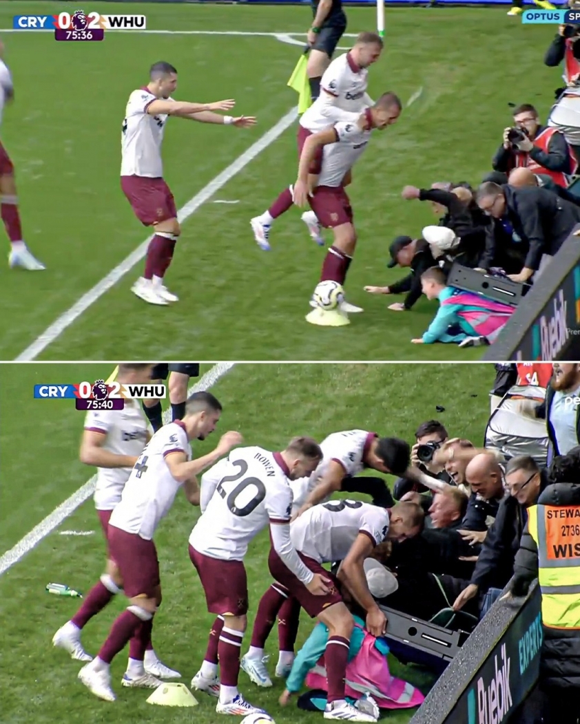 Trong lúc đang phấn khích với bàn thắng, Bowen, Soucek và các cầu thủ West Ham khác đã cùng nhau "giải cứu" cậu bé khỏi sự đè nặng của vật dụng kia cùng với sức ép từ các CĐV. Cậu bé này sau đó có vẻ đã rơi nước mắt vì đau đớn, và các cầu thủ đội khách đã hô hào đội ngũ y tế để chăm sóc cho cậu bé.