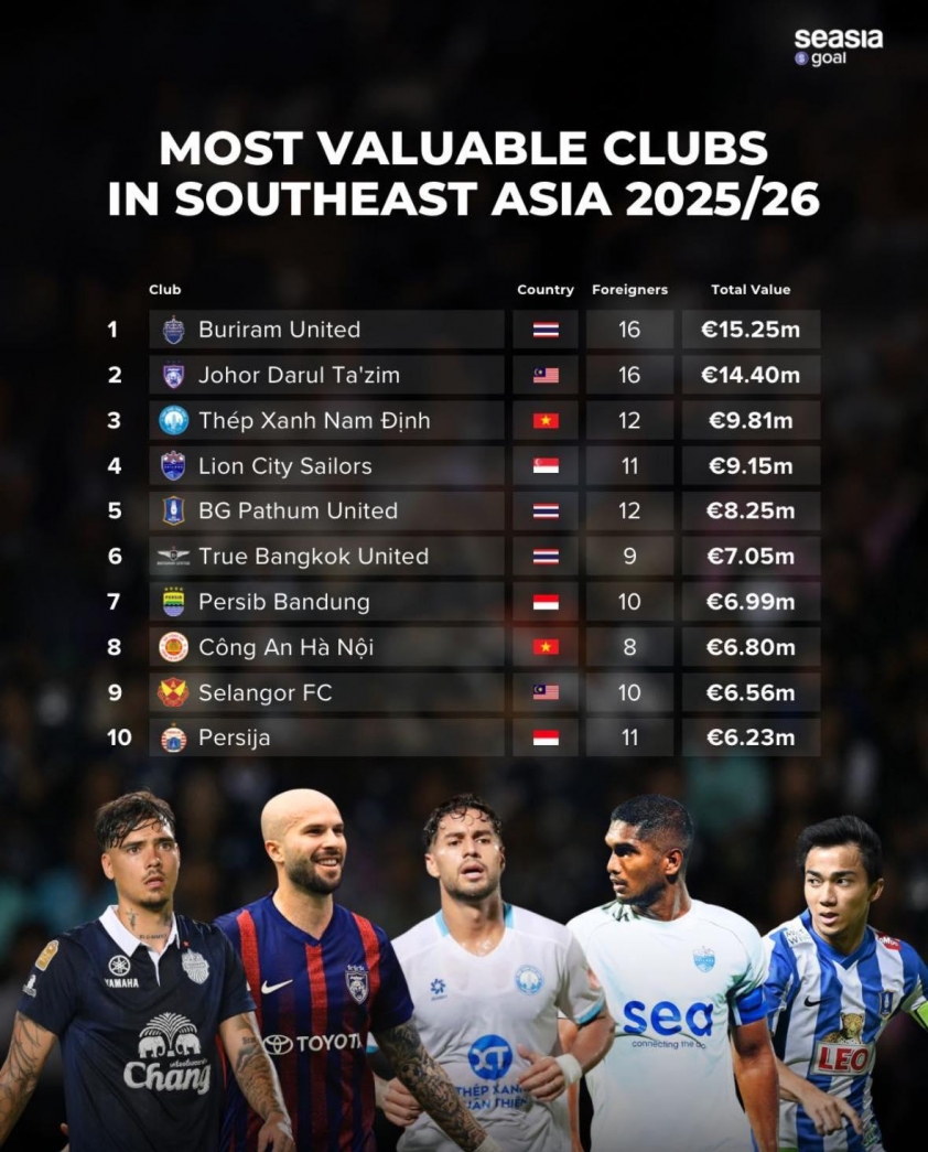 Theo đó, Buriram United tiếp tục khẳng định vị thế số một khi dẫn đầu bảng xếp hạng các CLB giá trị nhất Đông Nam Á ở mùa 2025/26, với tổng giá trị đội hình 15,25 triệu Euro. Đội bóng của Thái Lan có giá trị hơn 1 triệu Euro so với Johor Darul Ta’zim (14,10 triệu Euro), đại diện của Malaysia.