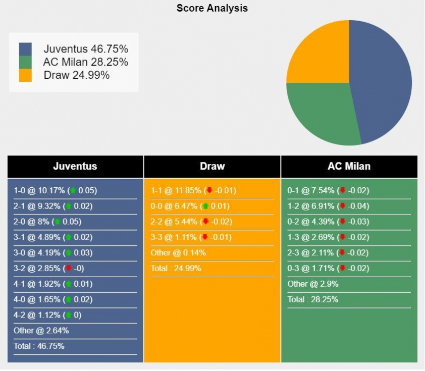 Tỷ số khả dĩ nhất để Juventus giành chiến thắng là 1-0 với xác suất 10,17% . Tỷ số có khả năng xảy ra tiếp theo cho kết quả đó là 2-1 (9,32%) và 2-0 (8%) . Khả năng thắng AC Milan cao nhất là 0-1 (7,54%) , trong khi tỷ số hòa là 1-1 (11,85%) .