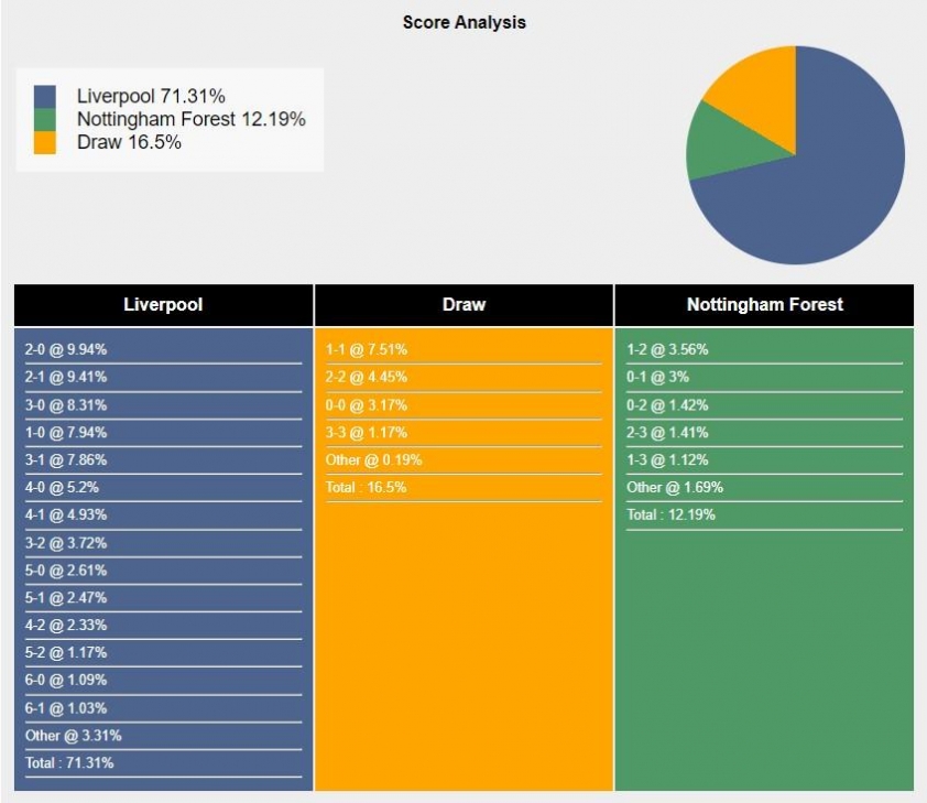 Tỷ số khả dĩ nhất cho chiến thắng của Liverpool là 2-0 với xác suất là 9,94%.Tỷ số khả dĩ thứ hai cho kết quả đó là 2-1 (9,41%) và 3-0 (8,31%).Tỷ số khả dĩ nhất là 1-1 (7,51%), trong khi tỷ số khả dĩ nhất cho chiến thắng của Nottingham Forest là 1-2 (3,56%).