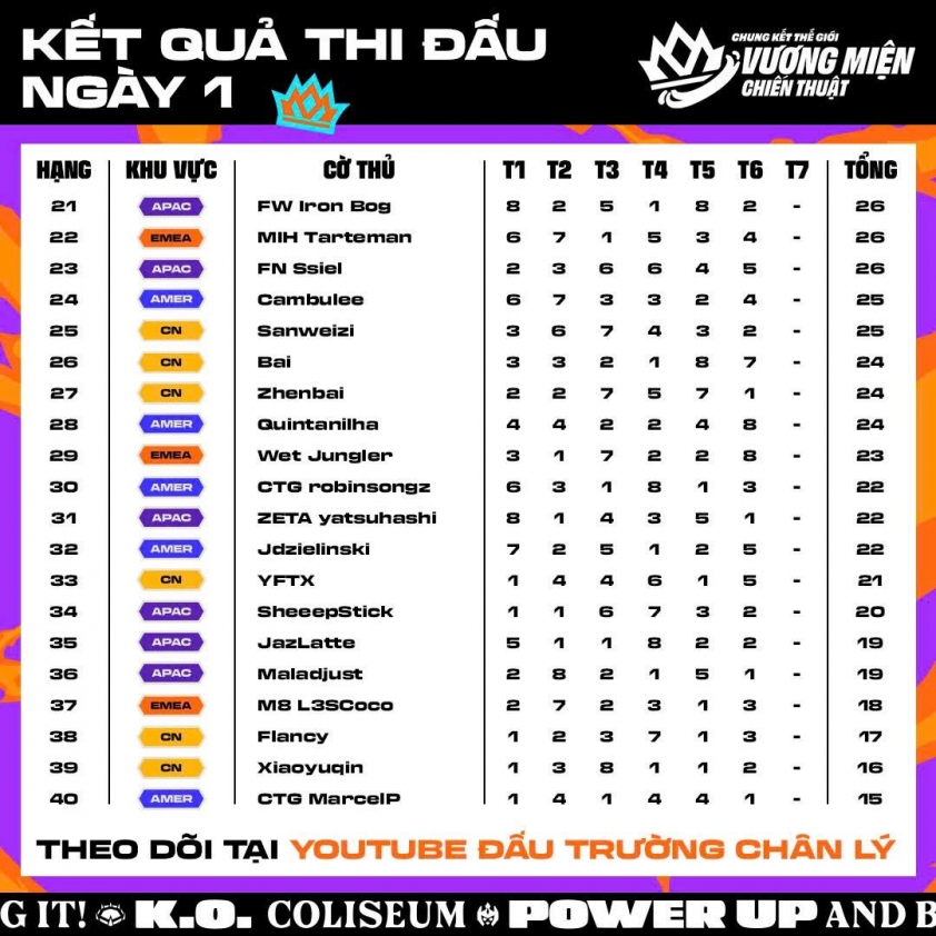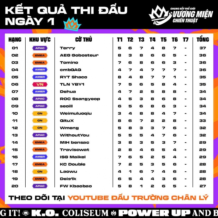 Cờ thủ YBY1 tạm thời dẫn đầu bảng xếp hạng sau hai ngày thi đấu, đứng trước cơ hội lần đầu tiên đăng quang giải vô địch thế giới DTCL.