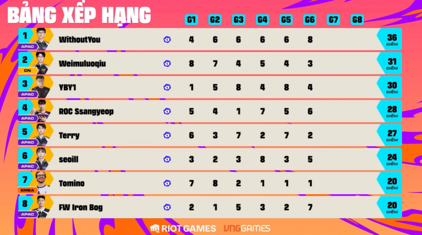 Cập nhật thứ hạng của các tuyển thủ tại Chung Kết Thế Giới Đấu Trường Chân Lý Mùa 15 - K.O. Coliseum Tactician's Crown.