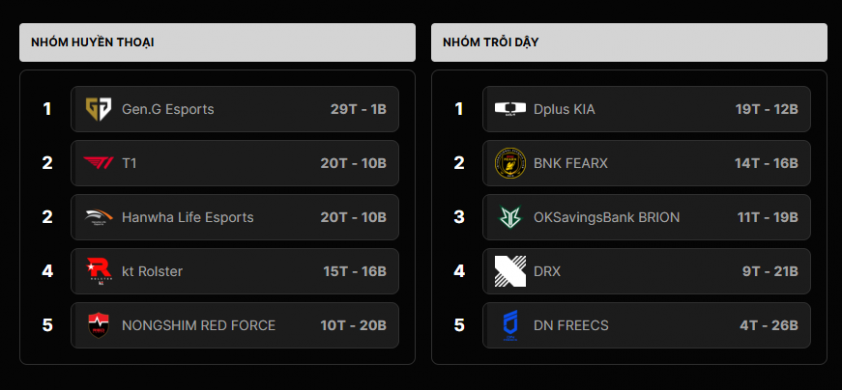 BXH LCK - Cập nhật thứ hạng của các đội tuyển tại giải vô địch LMHT Hàn Quốc LCK 2025. T1 hạng bao nhiêu?