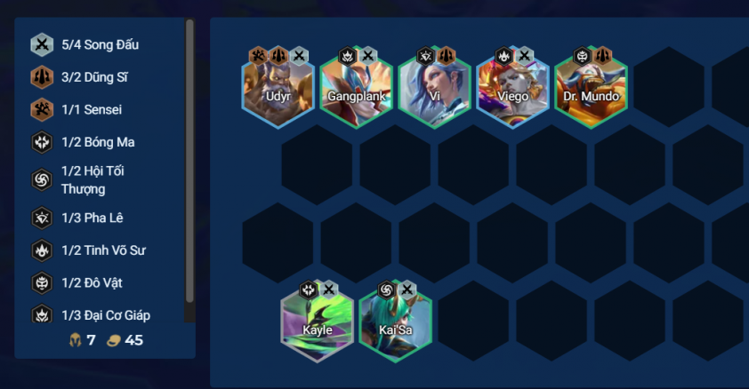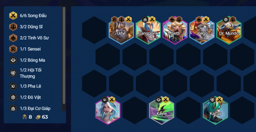 Khi tung đòn đánh, tướng Song Đấu nhận 2 Sức Mạnh Công Kích và Sức Mạnh Phép Thuật, cộng dồn tối đa 20 lần. Các tướng Đỡ Đòn Song Đấu thay vào đó nhận 2 Giáp và Kháng Phép. Nhận 1 Kai'Sa và 1 Kayle