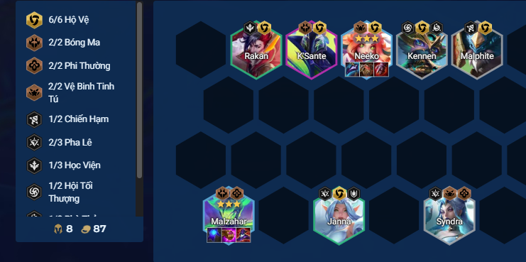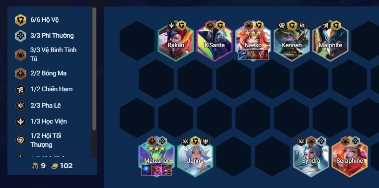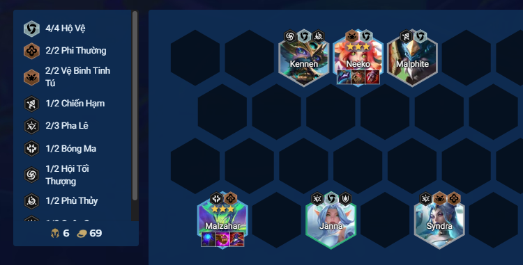 Đội hình này tập trung build cho Neeko và Malzahar. Khi đạt mốc 3 sao, với buff Hộ Vệ, Vệ Binh Tinh Tú và Phi Thường, Neeko không chỉ trâu mà còn tung chiêu liên tục, kích hoạt hiệu ứng giảm 40% sát thương và hồi rất nhiều máu.