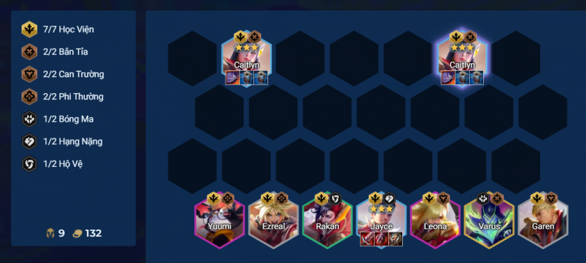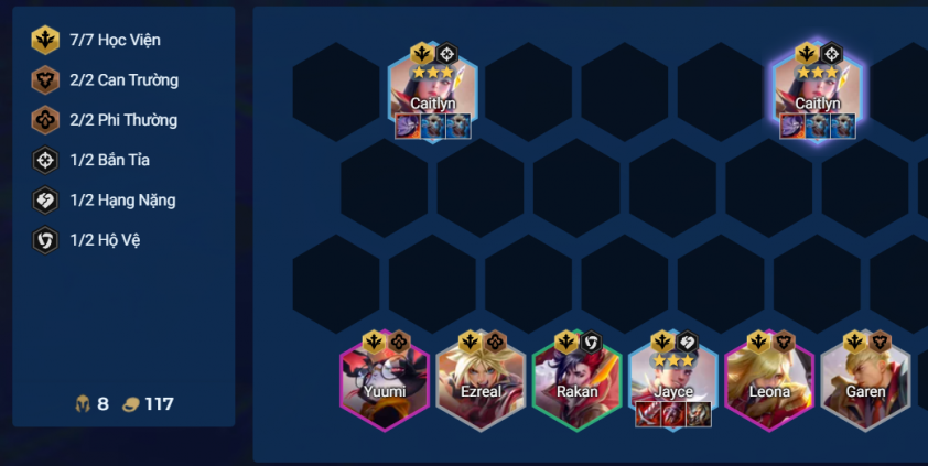 Tận dụng điều này, bạn có thể chơi đội hình Học Viện Reroll nang Cailtyn và Jayce lên 3 sao với bộ trang bị như trong hình. Lưu ý buộc phải có trái ác quỷ Phân Thân Bóng Tối và trang bị tạo tác Áo Choàng Mờ Ám.