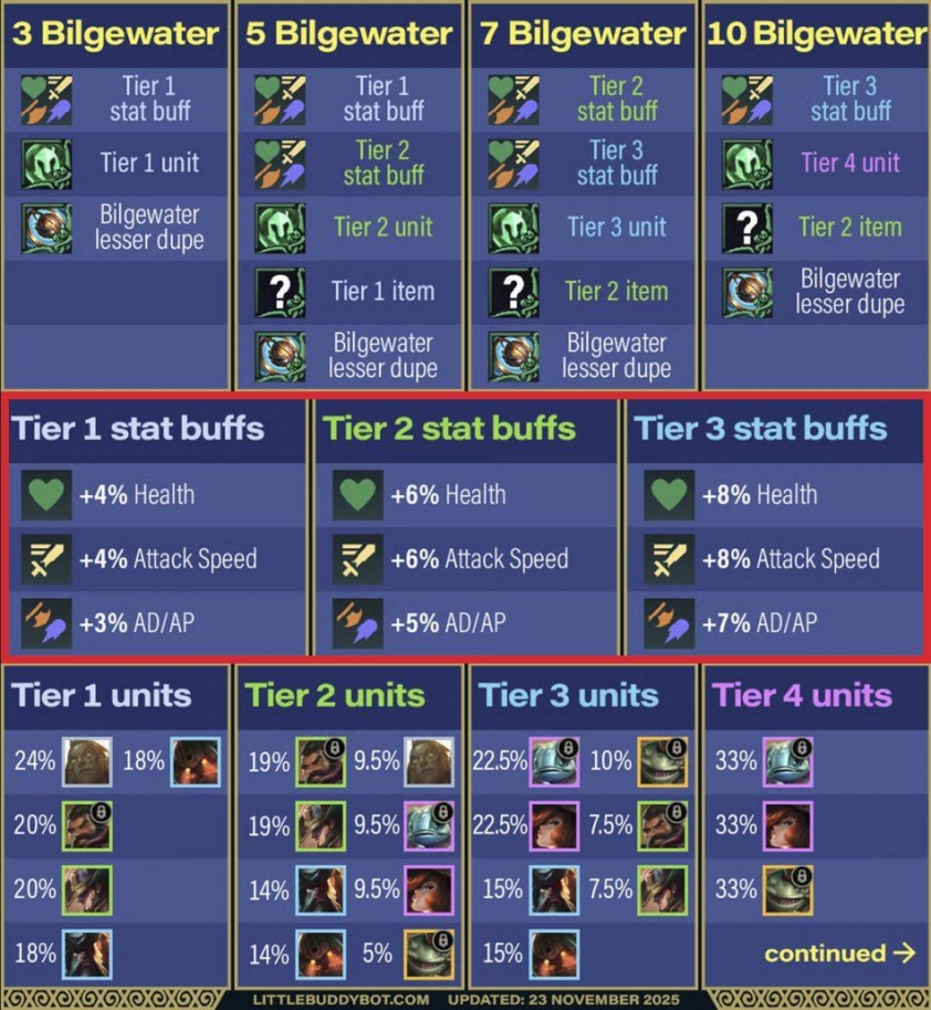 - Cuối trận chơi 7 Bilgewater vì tướng Bilgewater nào cũng được cộng rất nhiều chỉ số (mua bằng ngân xà từ đầu trận)